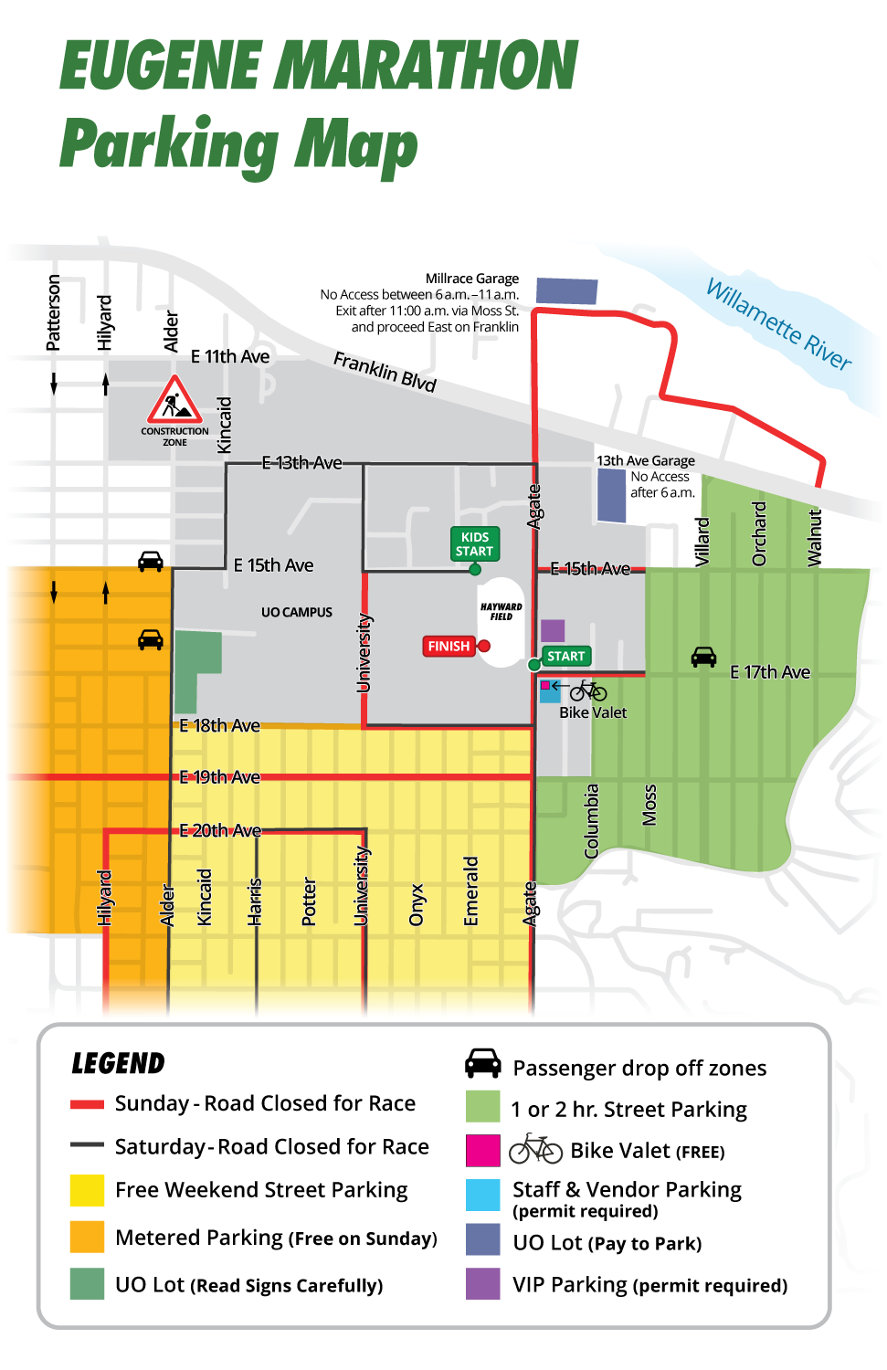 If someone is dropping you off or if you are utilizing a rideshare app on race morning, please give yourself extra time and use the drop-off locations indicated on the Parking Map above. The Eugene Marathon has doubled in size over the last three years, and as the event grows, so does pre-race traffic. Additionally, there is a significant amount of construction just west of the University of Oregon, so it’s more important than ever to check the map, pay attention to all road closures, and direct your drivers to drop you off at the designated locations.